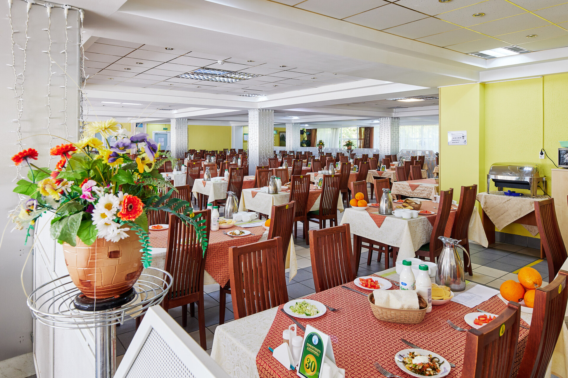Обеденный зал рассчитан на 320 человек, в том числе 100 посадочных мест – отделение «Мать и дитя».
