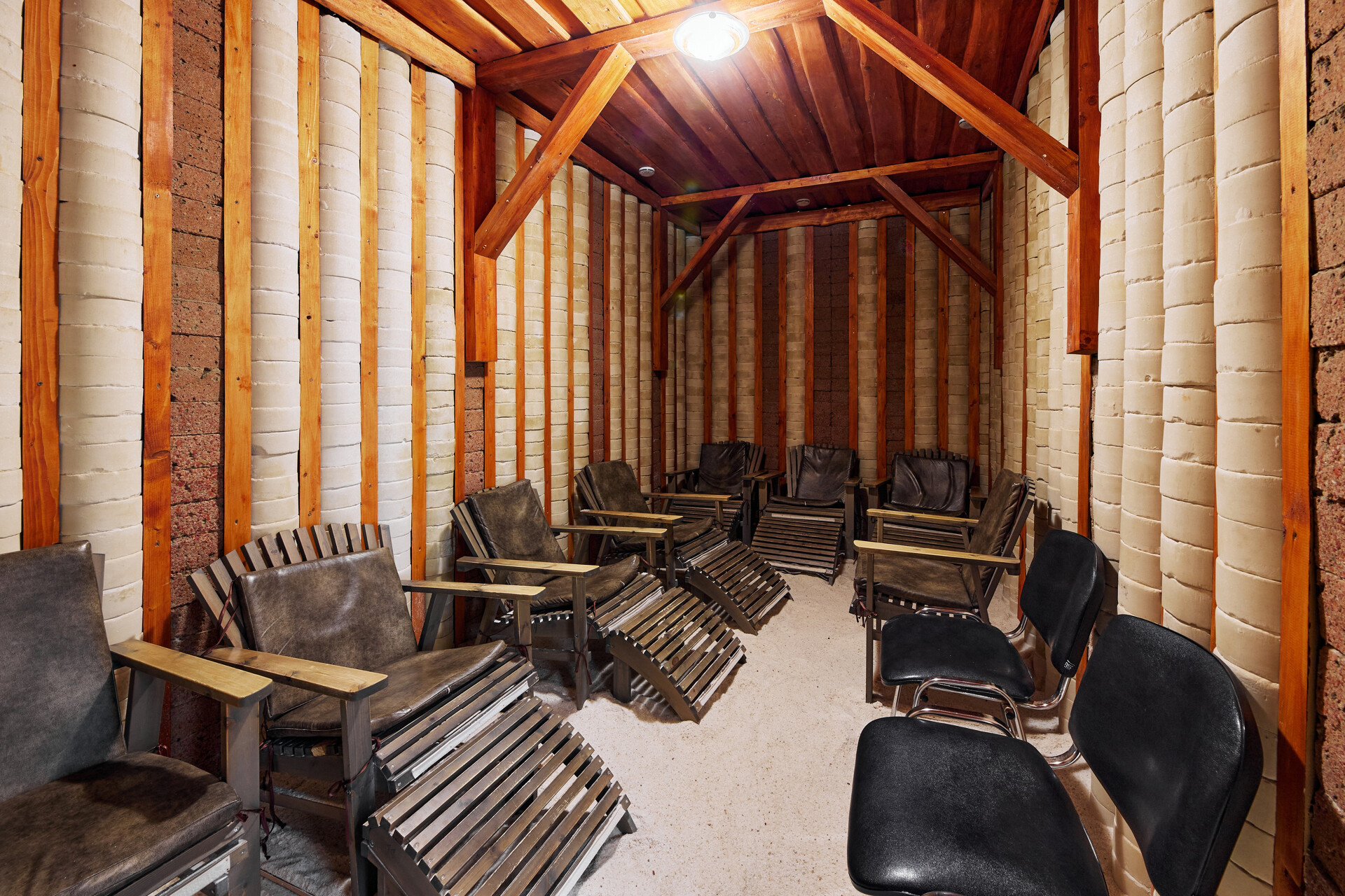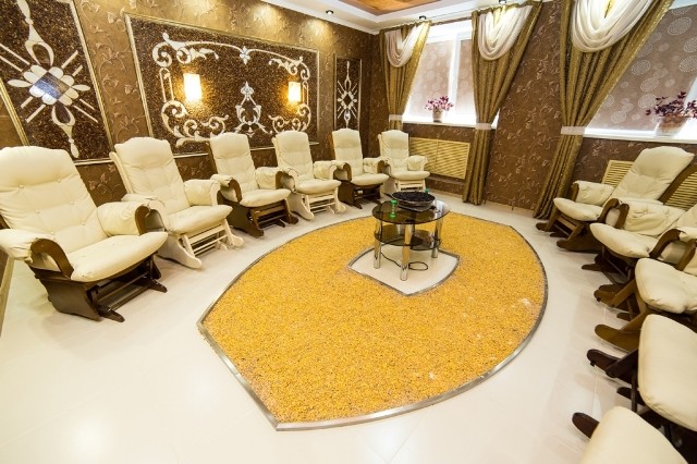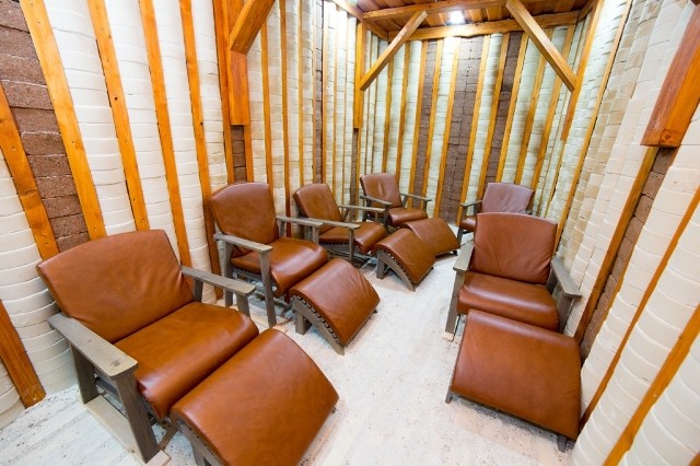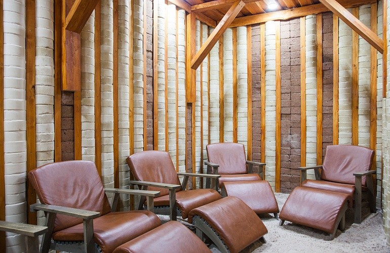 Спелеотерапия – универсальное лечение. Спелеоклиматичекая камера санатория представляет собой соляную комнату со стенами и полом из блоков, изготовленных из красной и белой соли древнего океана, добытых в Солигорских рудниках.